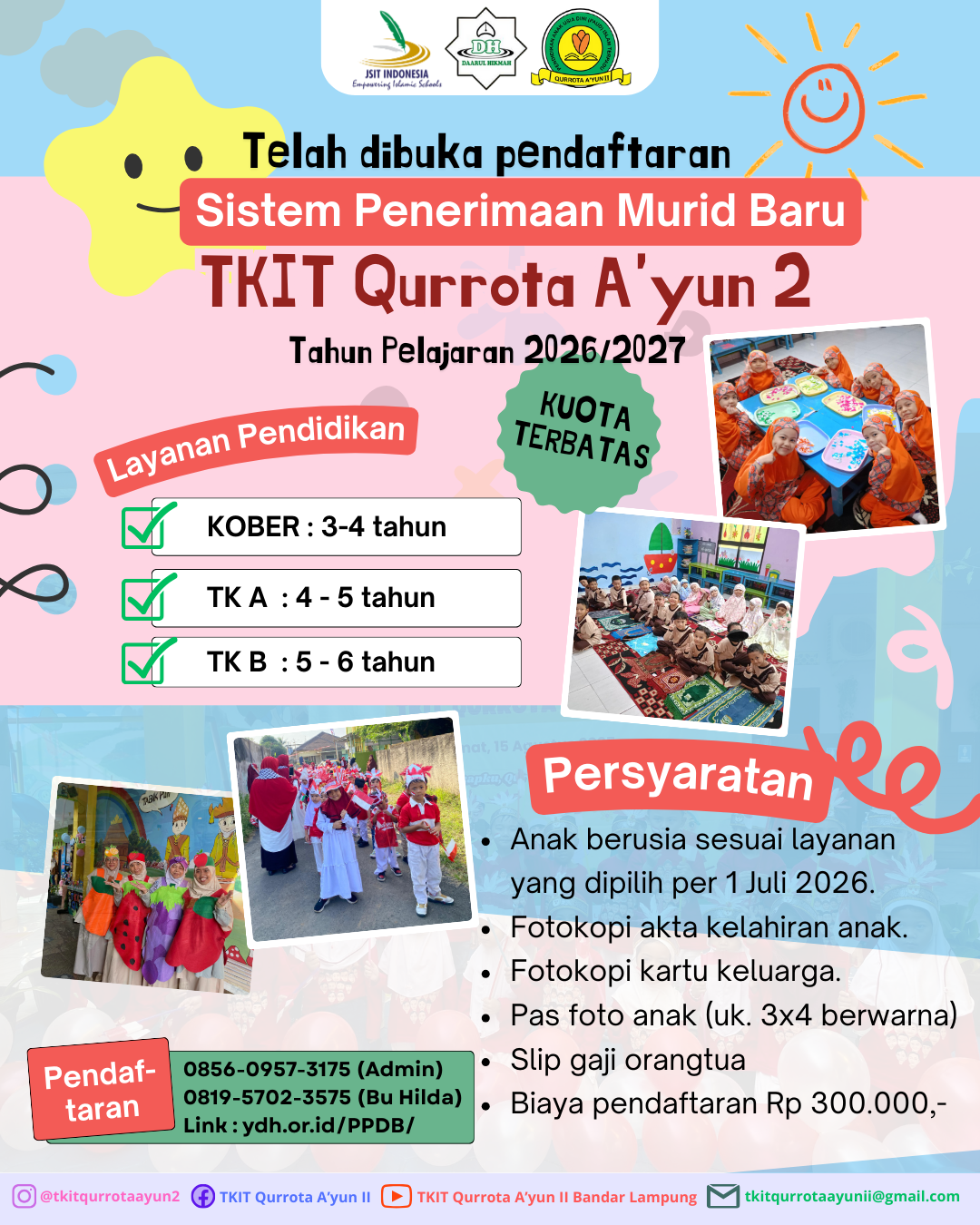 *INFO PENTING* >>> Sedang Berlangsung <<< ” GELOMBANG 2 ” Penerimaan Peserta Didik Baru (PPDB) T.P. 24/25 TKIT Qurrotaa’yun 2 Teluk Betung Ada yang baru